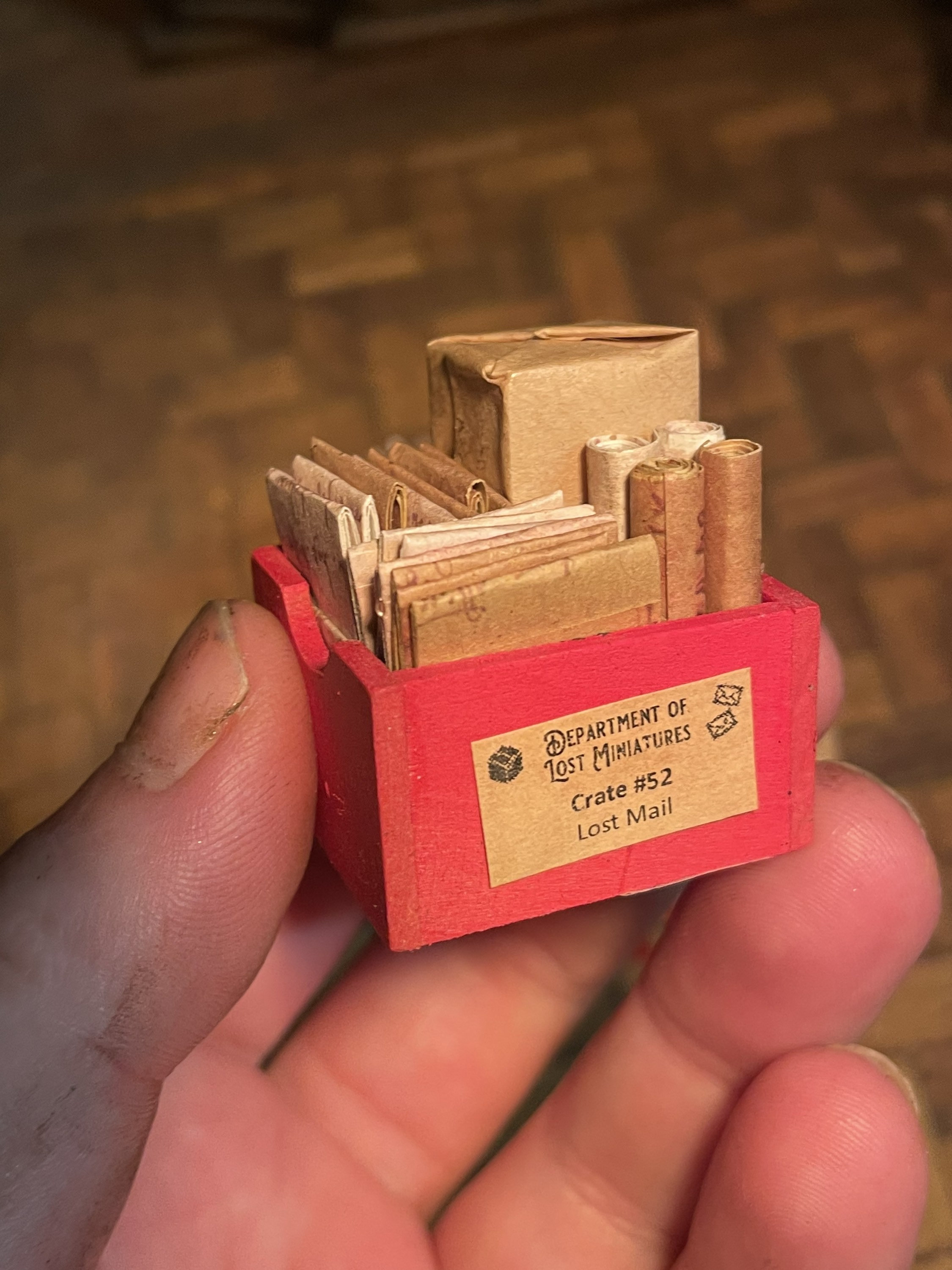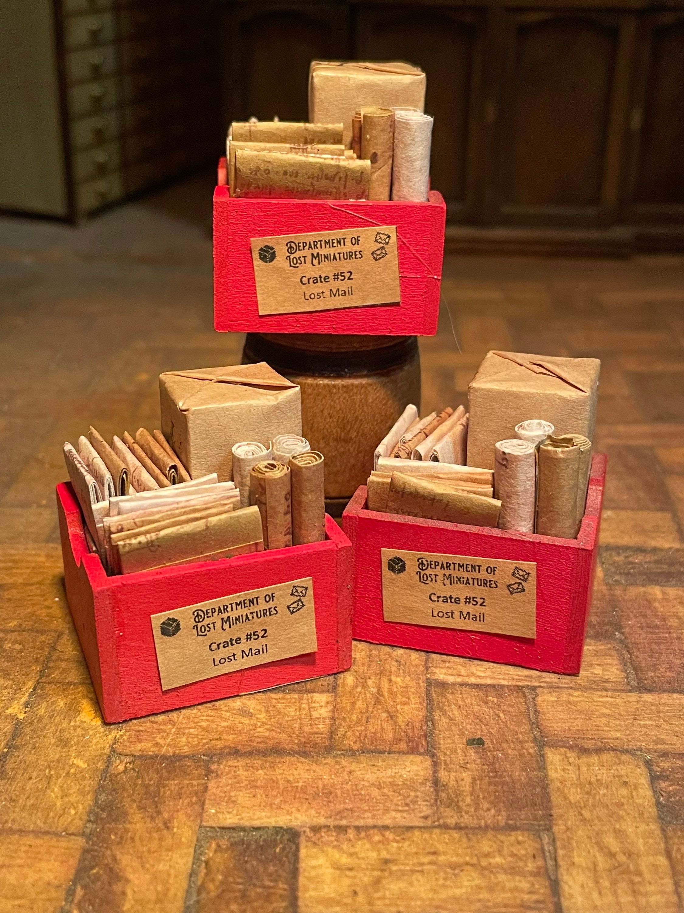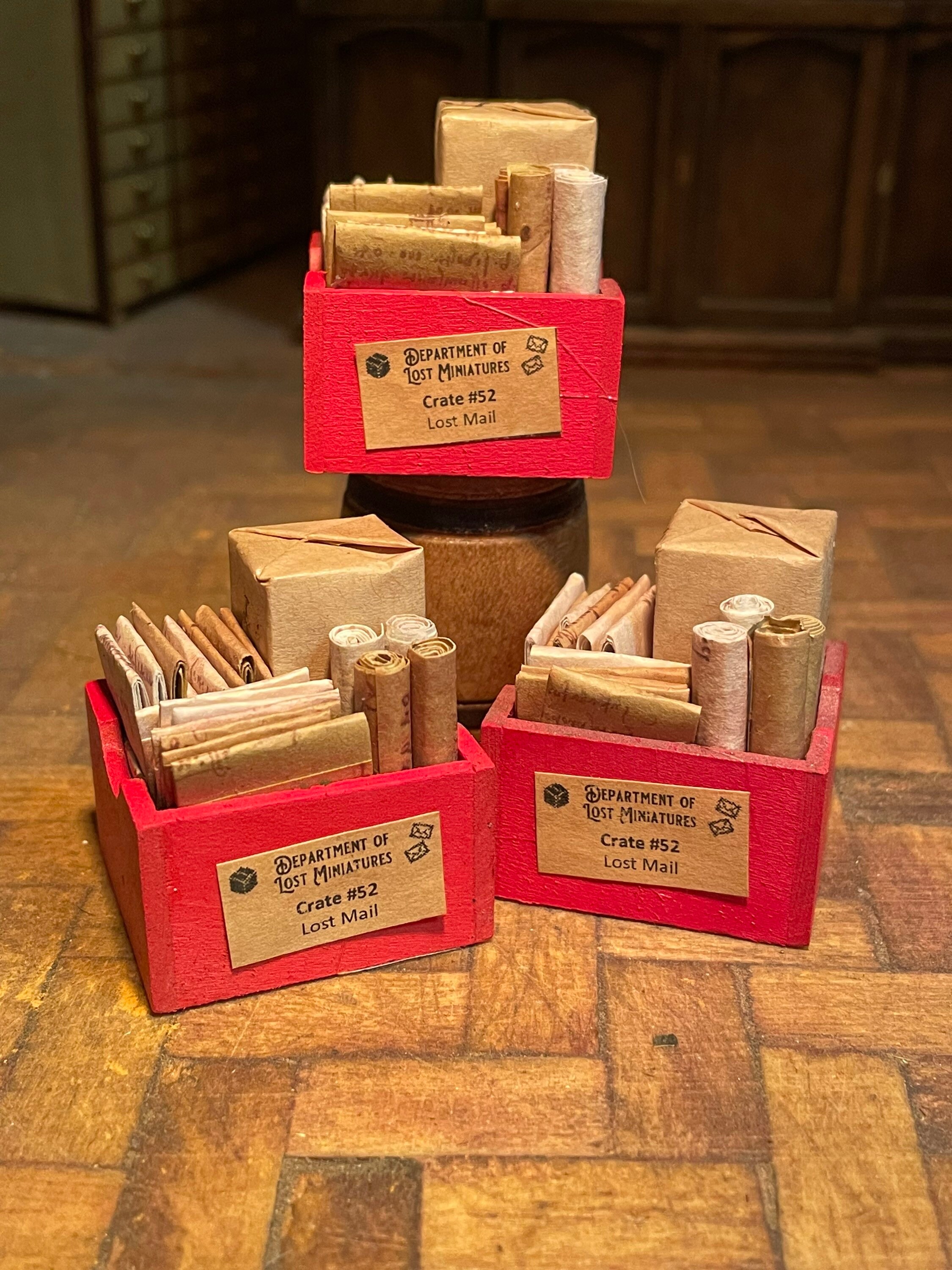 These small wooden crates are perfect for a dollhouse, diorama or miniature scene and can be used in a variety of settings from postal service rooms, miniature libraries, abandoned buildings, laneways, research offices, museums, halloween displays and more!