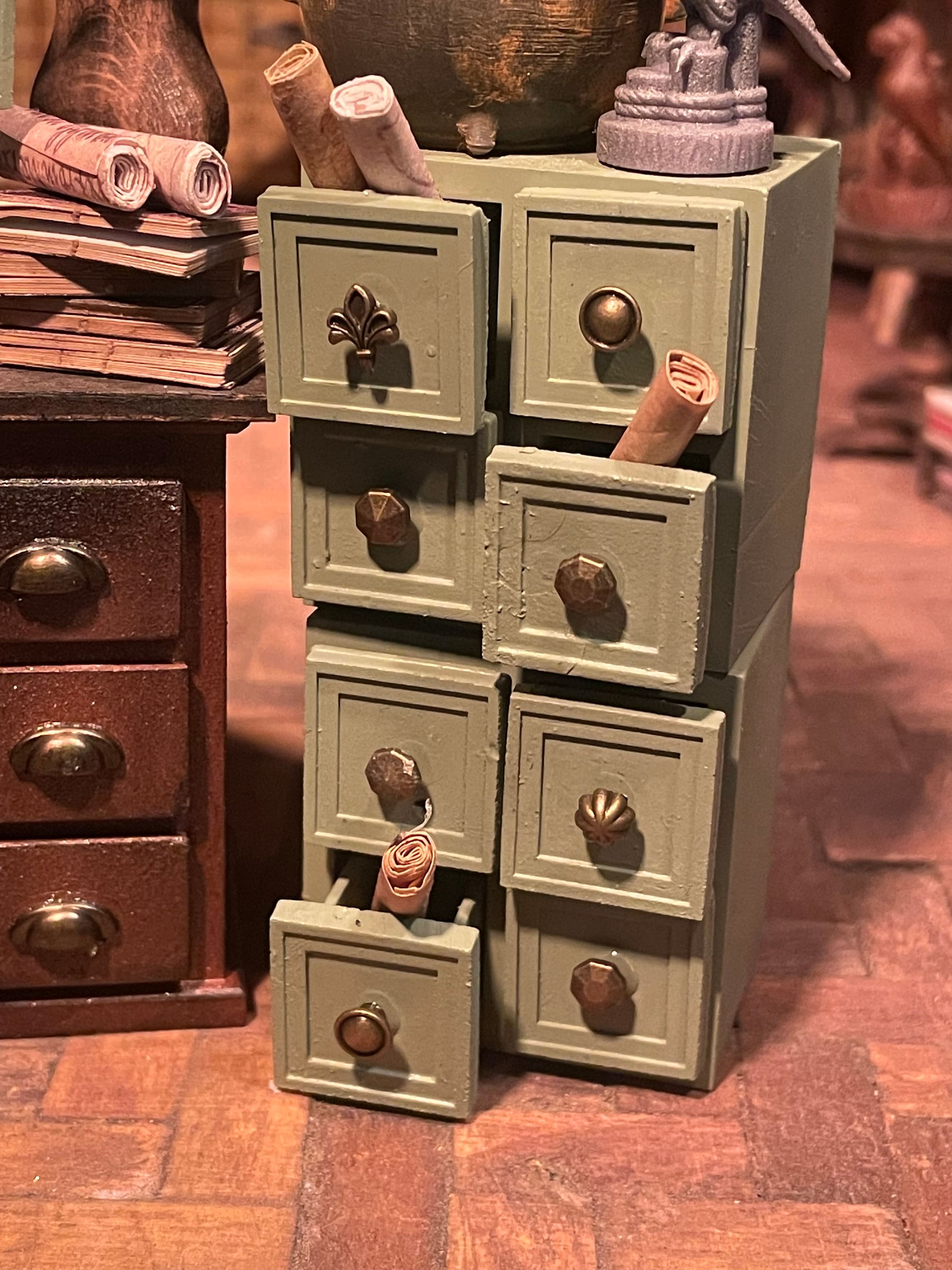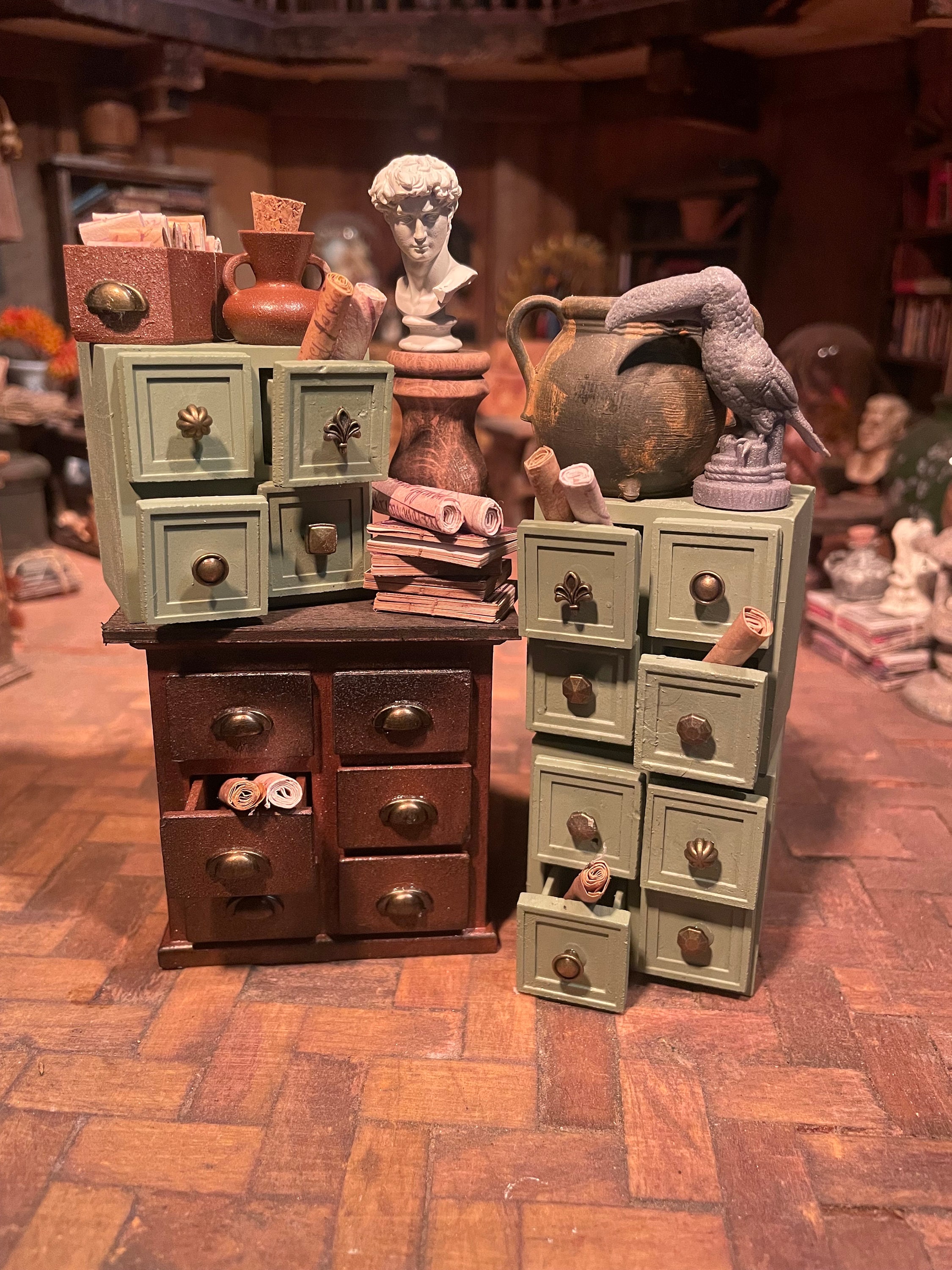Compliments the large and small library archive drawers, bookcases and crates along with apothecary bottles all available in the Lost Miniatures Etsy store!