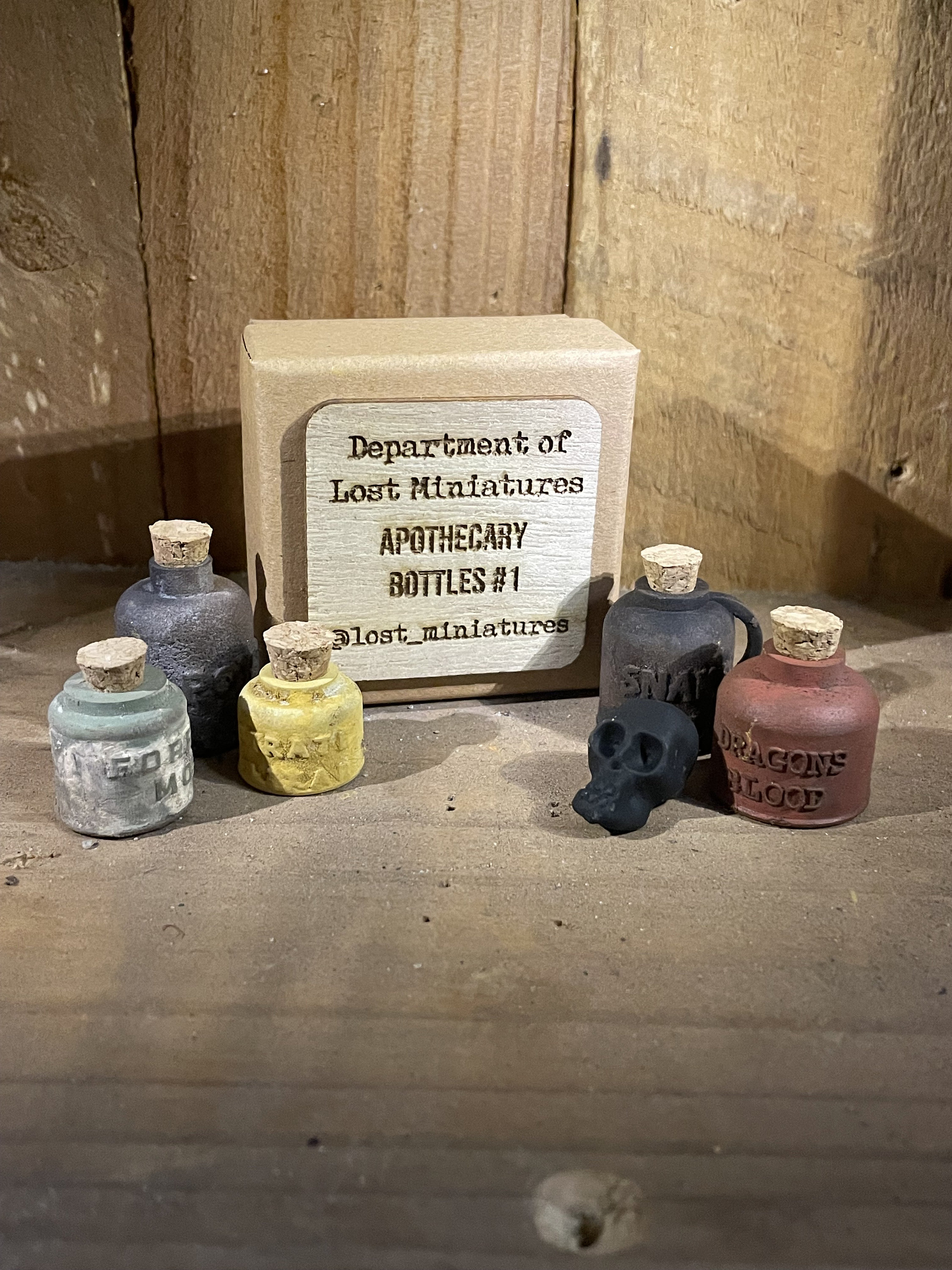 The Department of Lost Miniatures is a gold mine of Lost and forgotten potions, rare ingredients and surprise concoctions! These sets of apothecary bottles are the must haves for any witch, wizard, researcher or scientist!