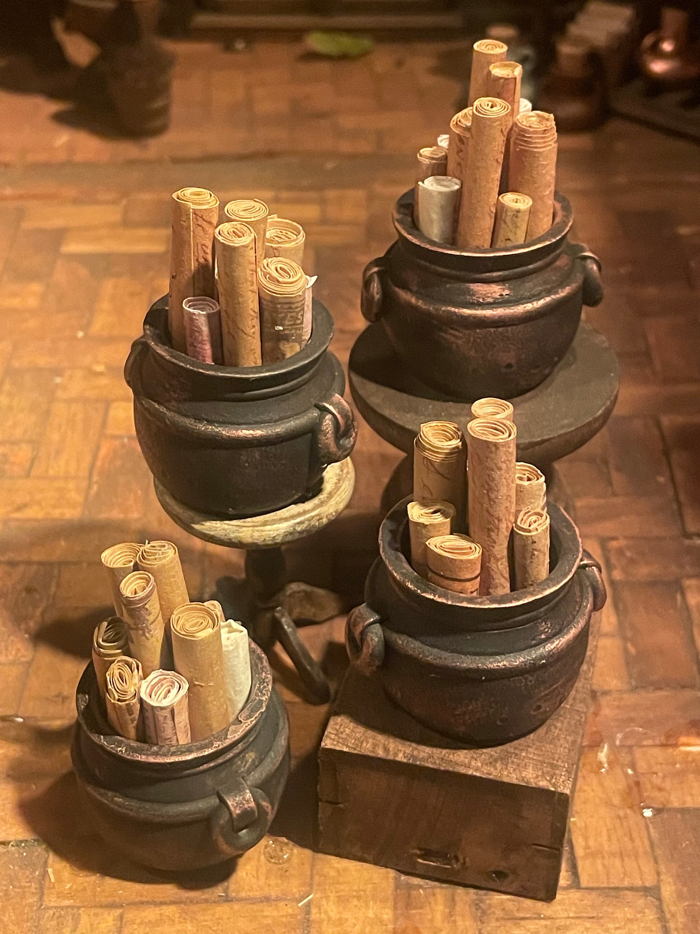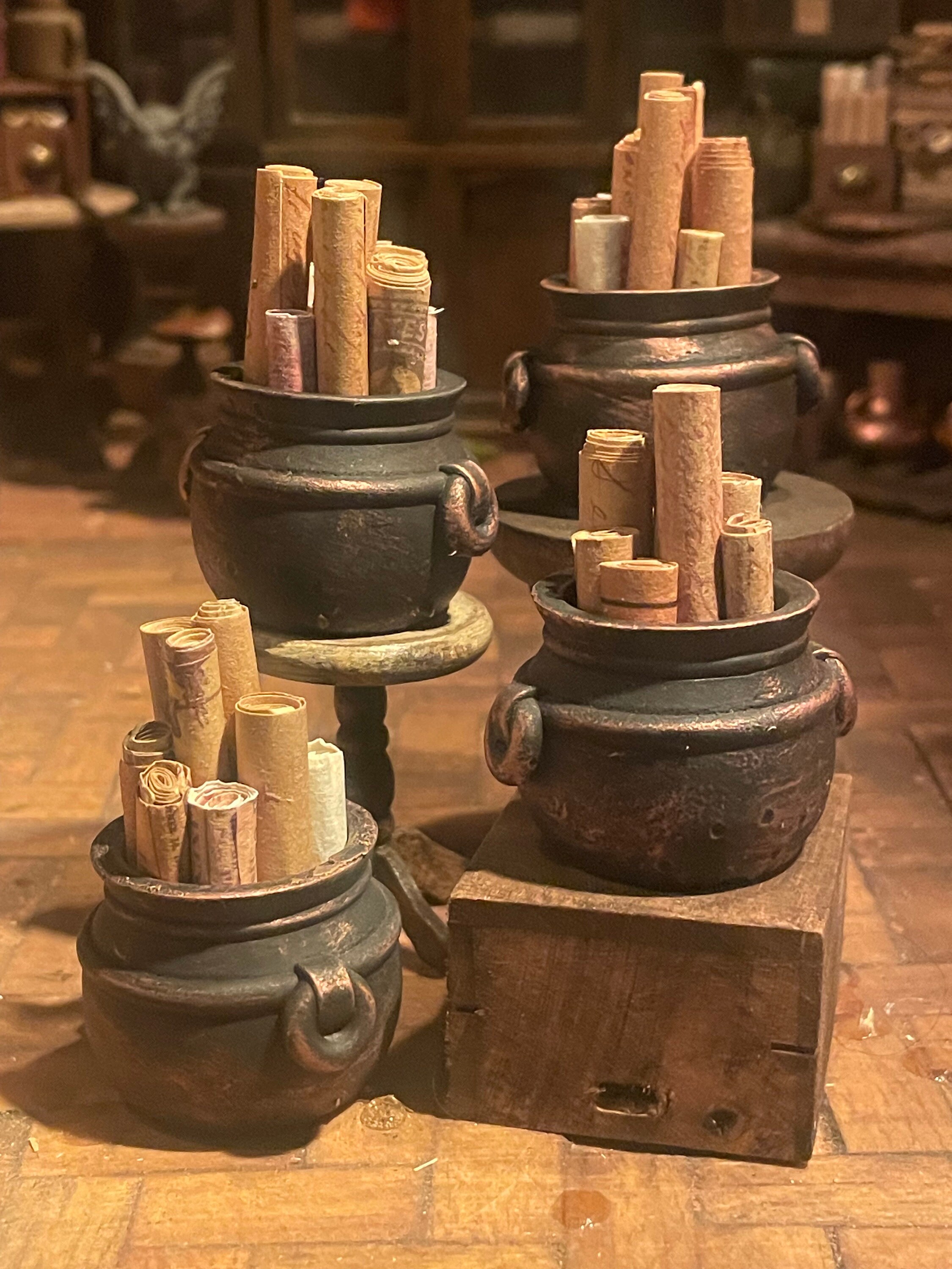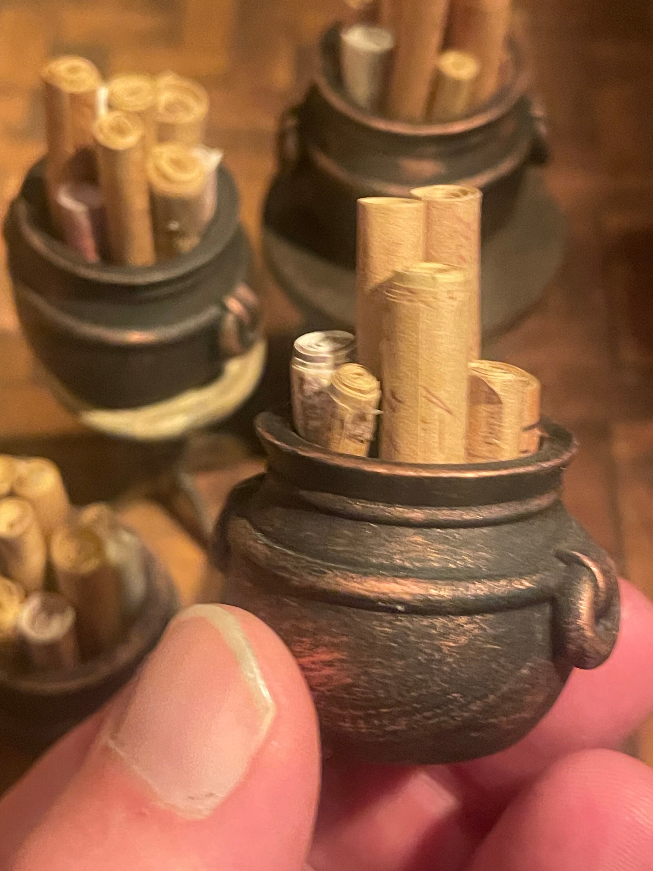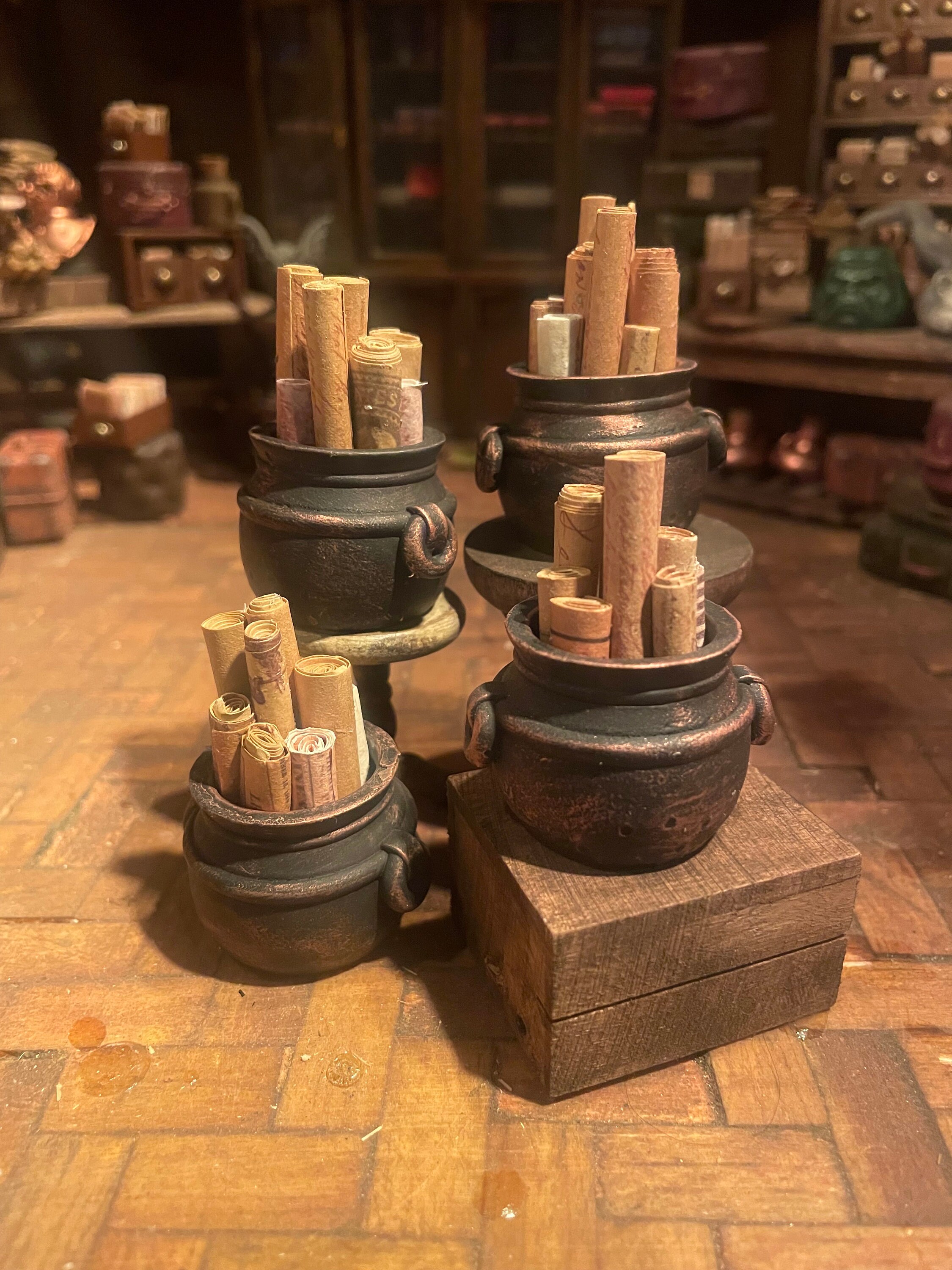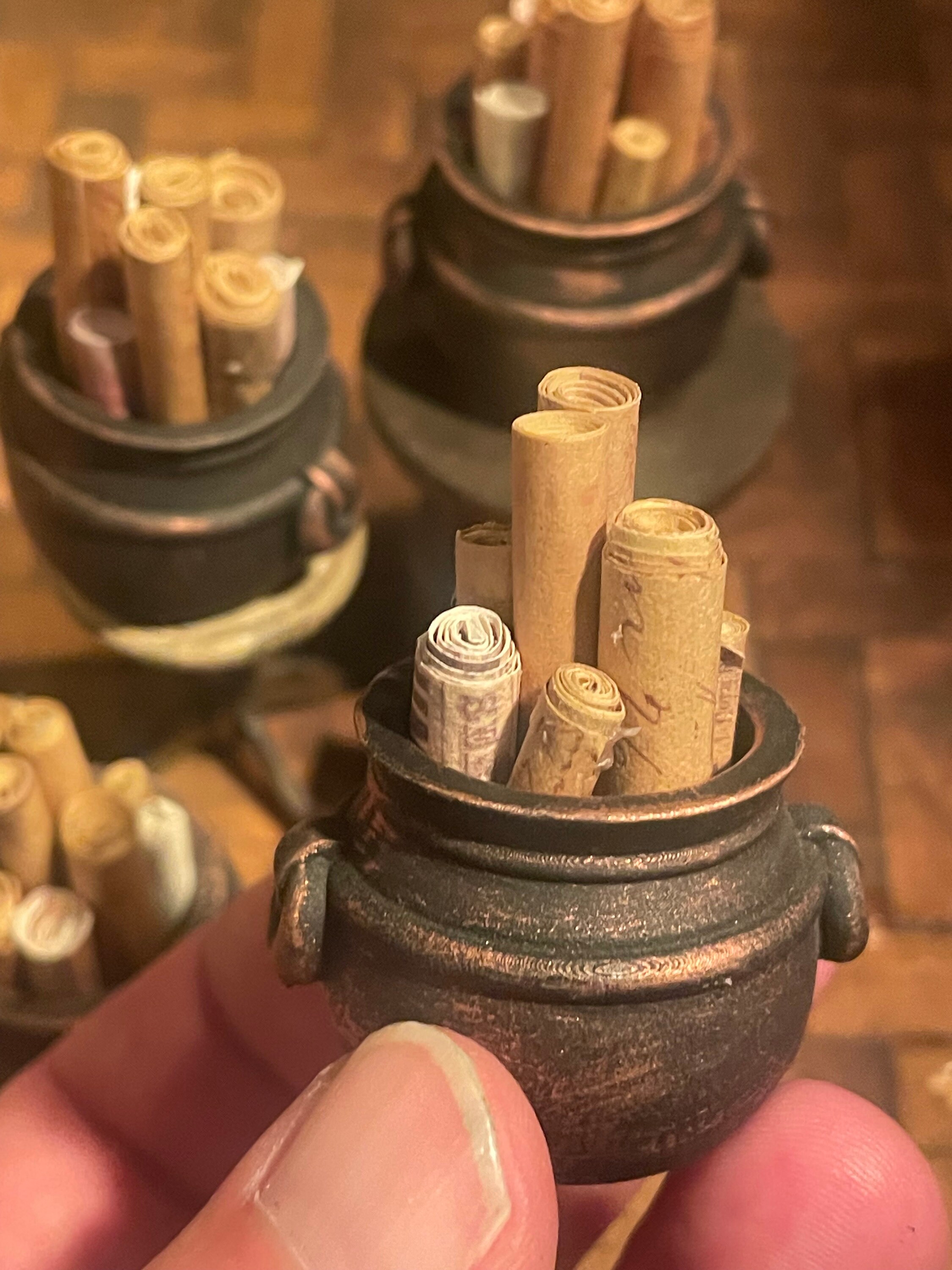 The cauldron stands at 4cm tall and 4.4cm in diameter - the scroll bundle adds around 2cm to the height.