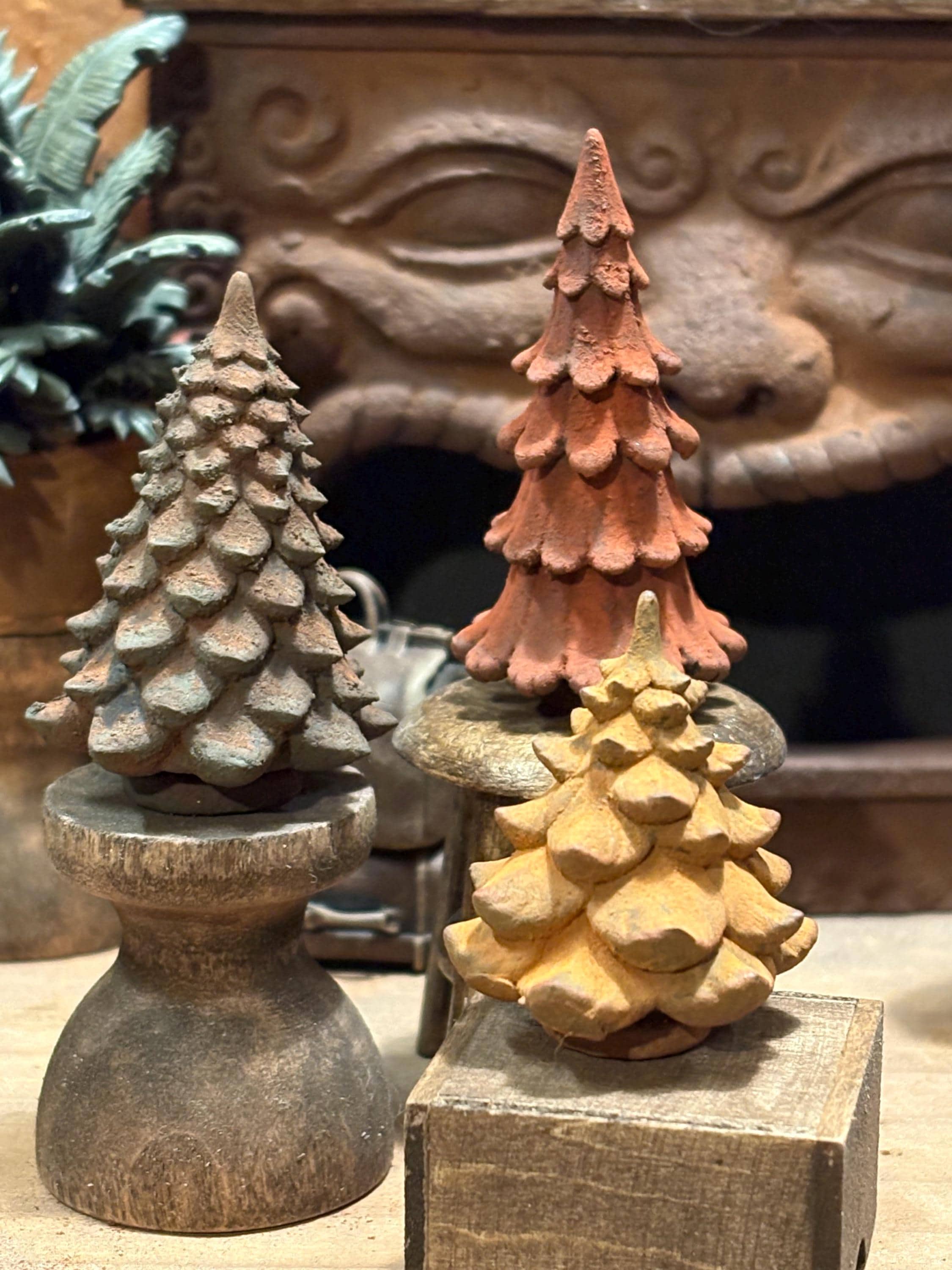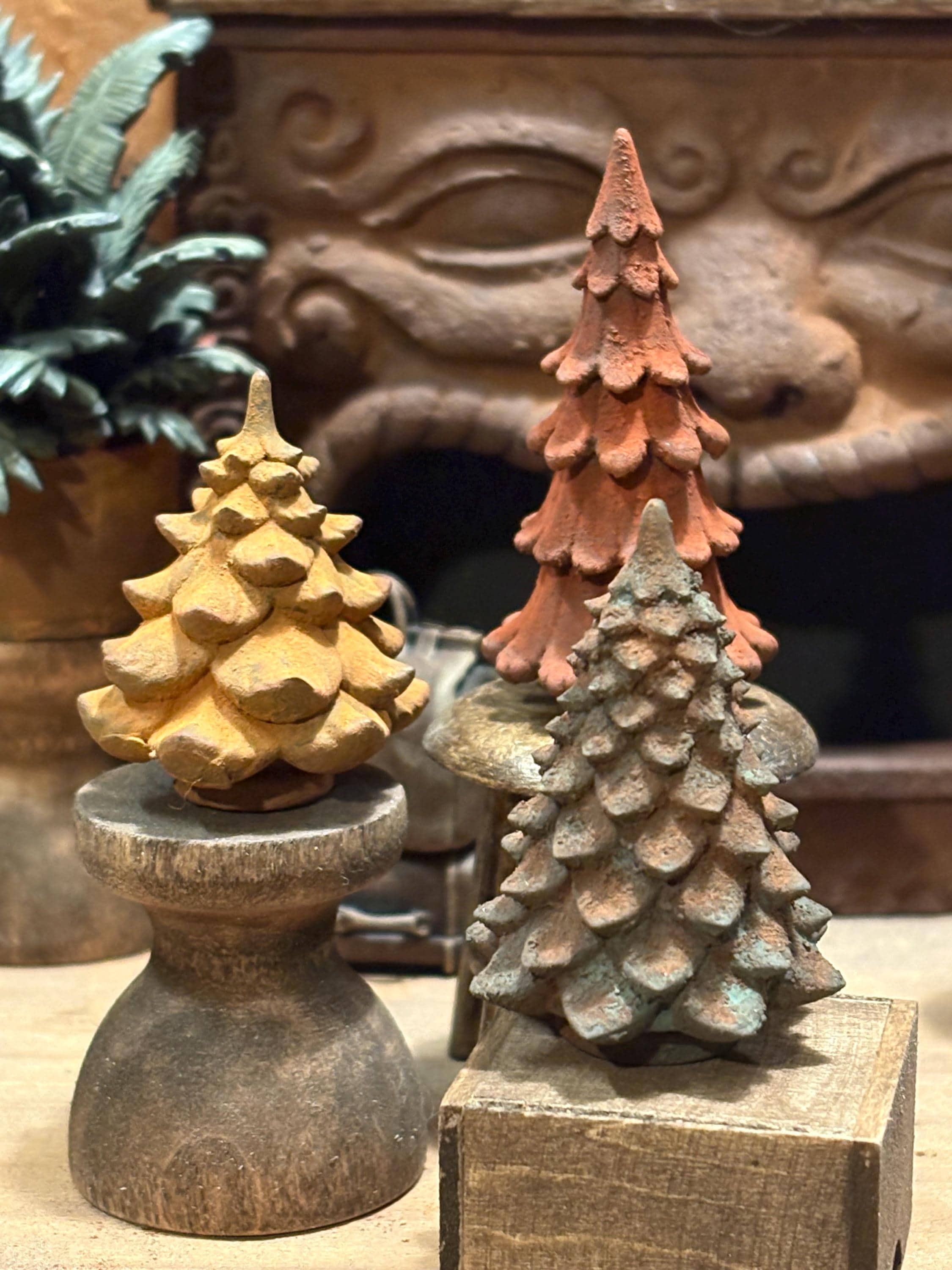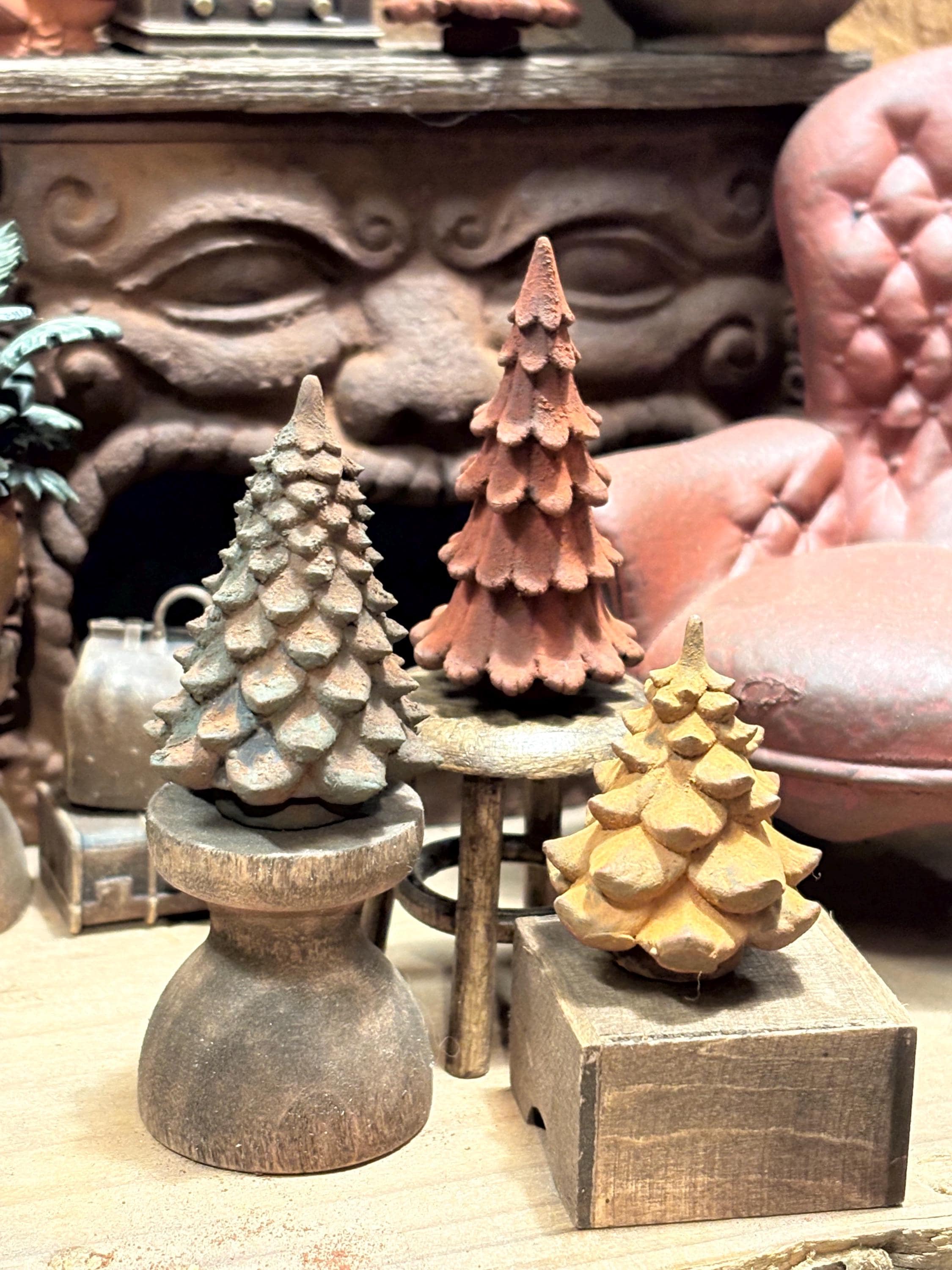 The mantle of each fireplace at The Department of Lost Miniatures is decorated every season with these incredible vintage trees - three unique styles with various heights and finishes that echo the warmth and style of the ancient underground vaults!